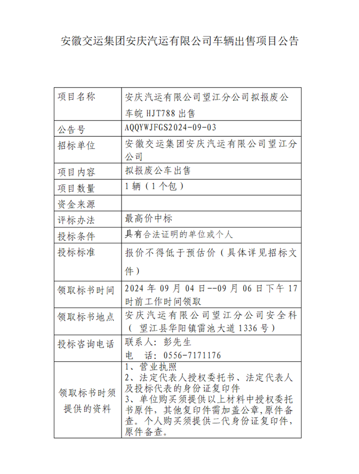 望江分公司擬報廢公車皖HJT788出售項(xiàng)目公告